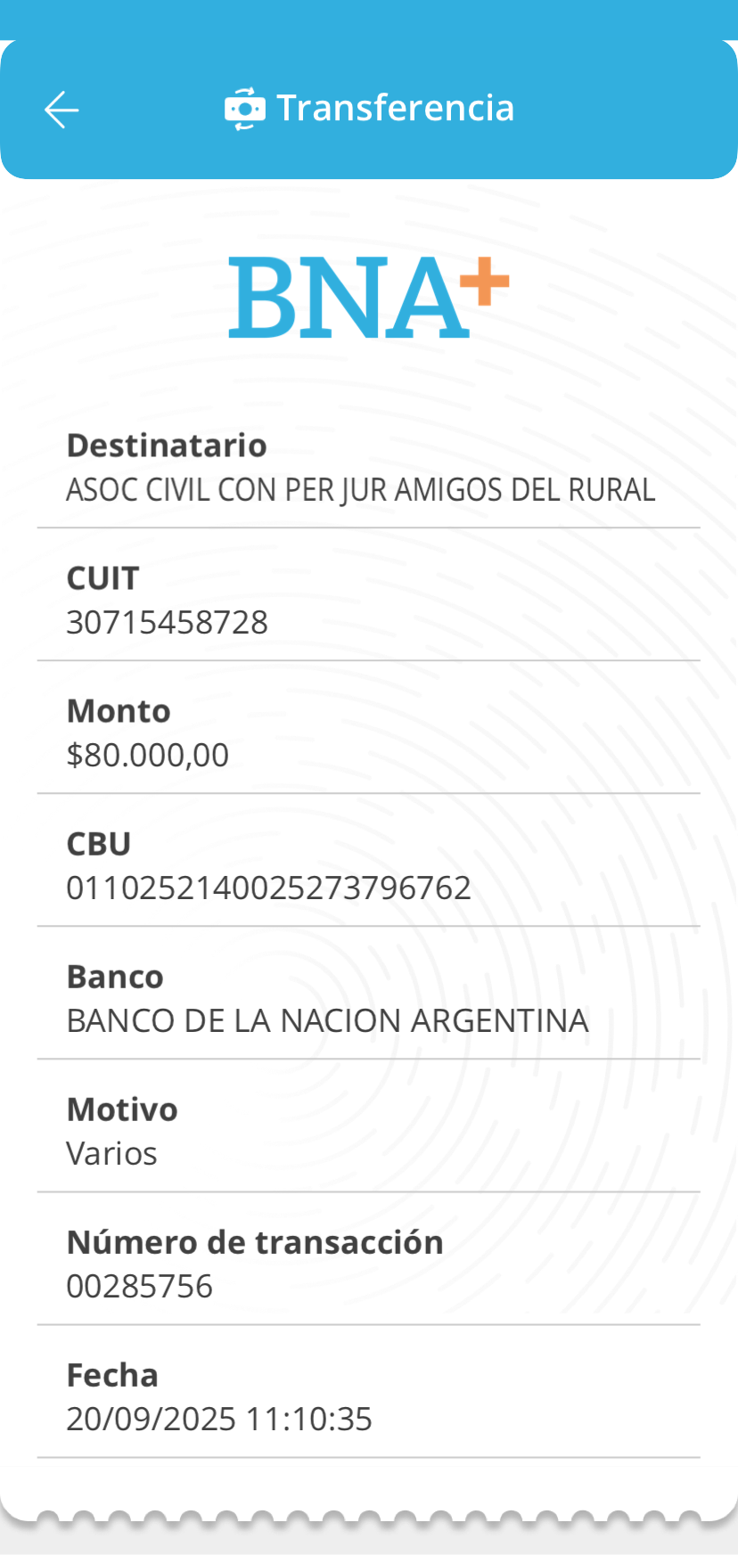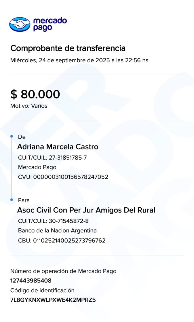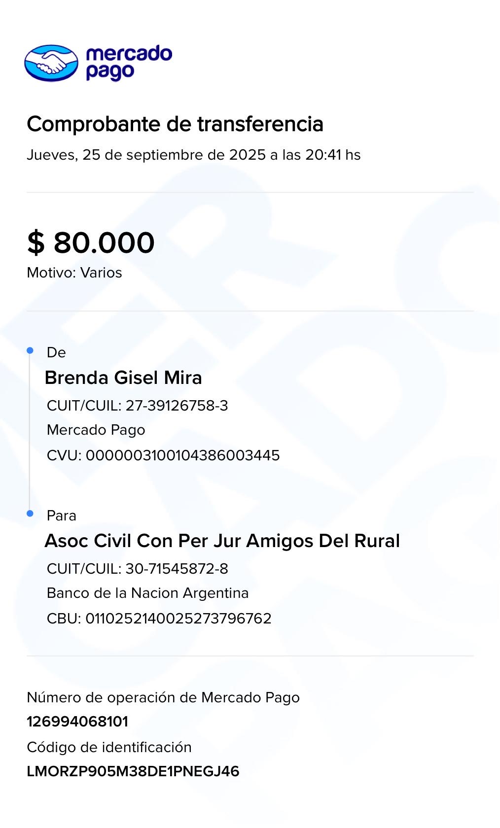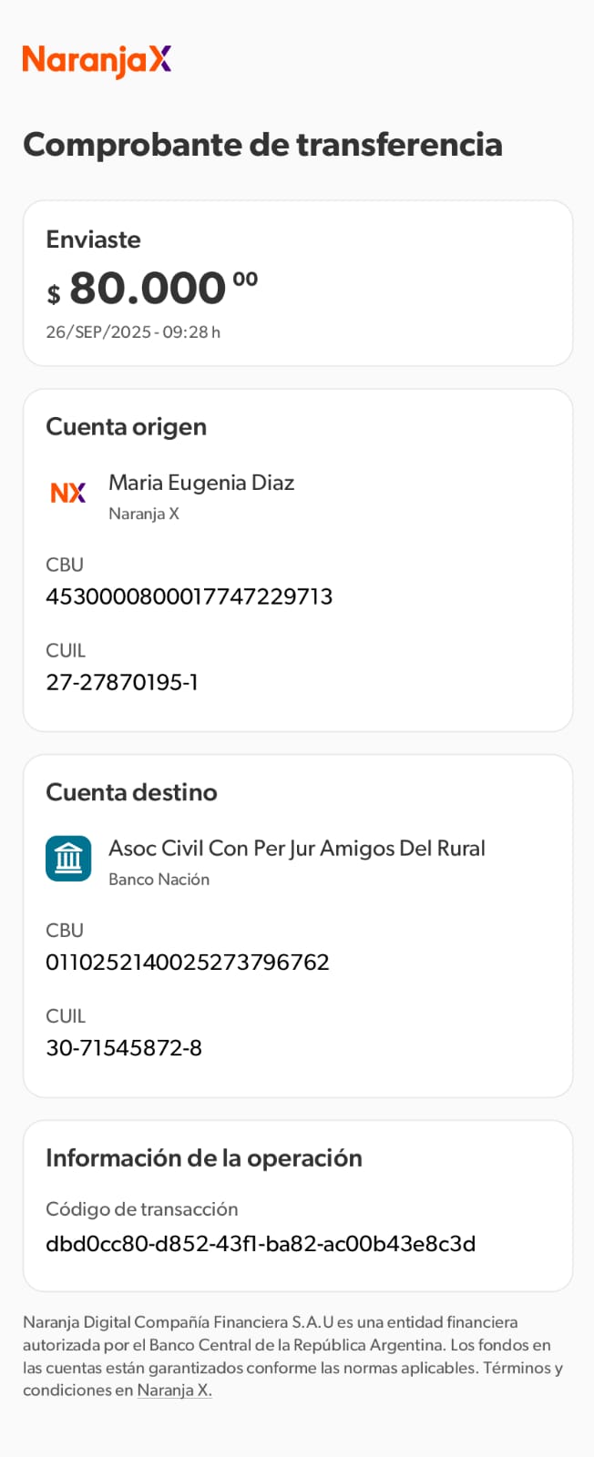 | Rita Mercado | ********** | DNI | 38099091 | Rita valeria mercado | 16/08/1992 | 33 | Femenino | San Juan 331 | Brinkmann | 2419 | Cordoba | ritavaleriamercado@gmail.com | +543562548675 | DAMAS - Master A- Años: 1995-1994-1993-1992-1991-1990-1989-1988-1987-1986 | Hasta el 27 de septiembre de 2025 distancia 75K $80,000 | | transferencia_a_otras_cuentas.pdf