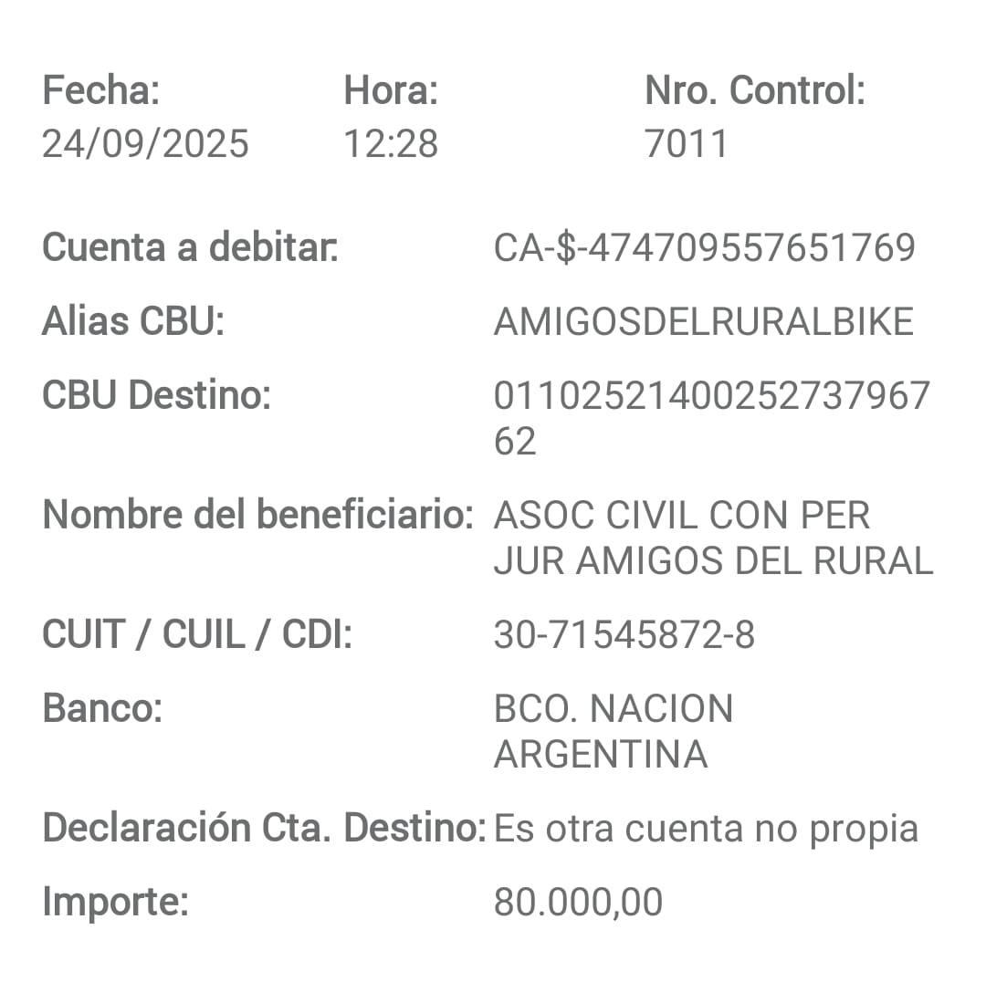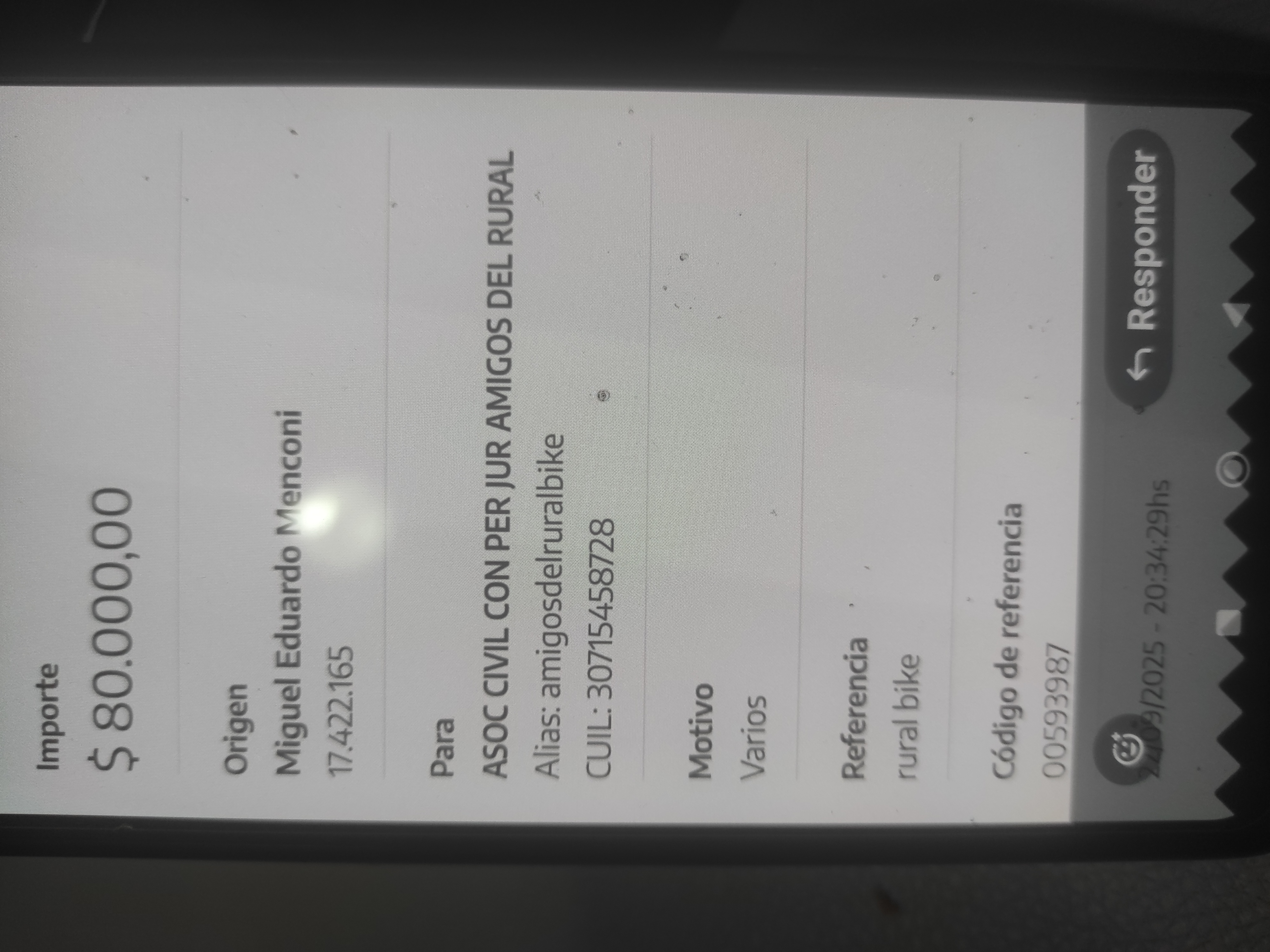 | horacio villata | ********** | DNI | 36006998 | horacio villata | 13/10/1991 | 33 | Masculino | cullen 186 | esperanza | 3080 | santa fe | horacio.villata@hotmail.com.ar | +543496528608 | HOMBRES - Master A1- Años: 1995-1994-1993-1992-1991 | Hasta el 27 de septiembre de 2025 distancia 75K $80,000 | | Pago-BICI.jpeg