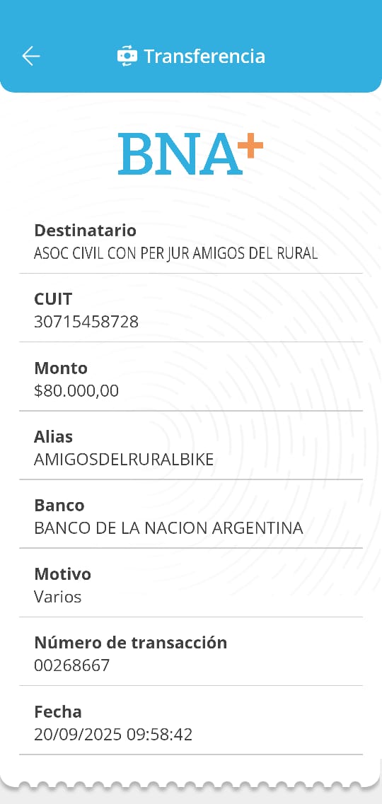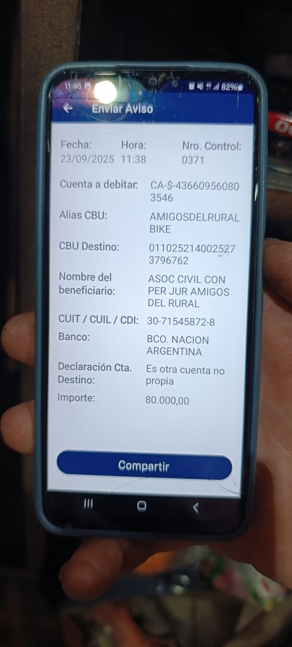 | Solbike | ********** | DNI | 23801151 | Javier Norberto Solari | 31/01/1974 | 51 | Masculino | Suipacha 437 Rafaela Santa Fe | Rafaela | 2300 | Santa Fe | solbikerafaela@gmail.com | +543492284421 | HOMBRES - Master C1- Años: 1975-1974-1973-1972-1971 | Hasta el 27 de septiembre de 2025 distancia 75K $80,000 | | Screenshot_20250922-200317_Galicia-Office.jpg