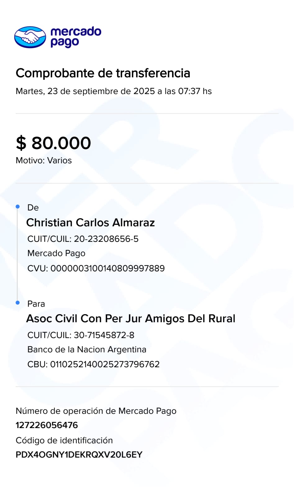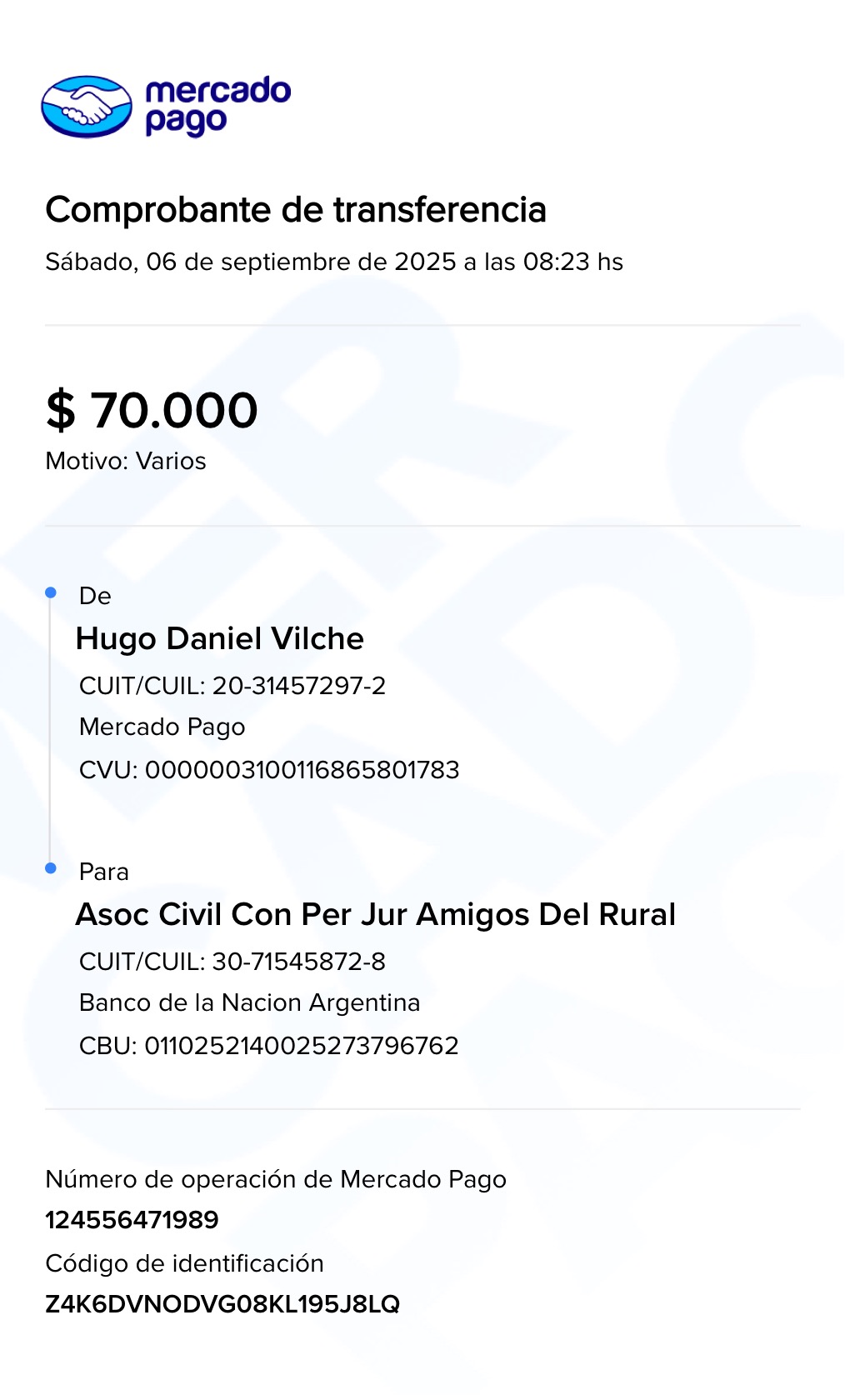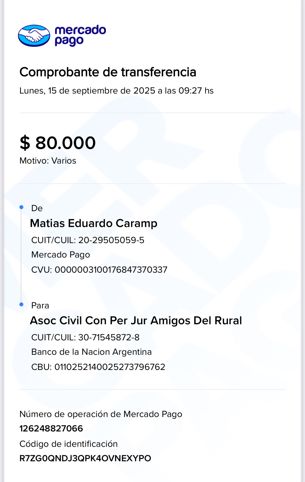 | Caruca | ********** | DNI | 16092508 | Sergio Carmassi | 16/10/1962 | 62 | Masculino | Roca 2242 | San Lorenzo | 2200 | Santa fe | carmassicaruca@gmail.com | +543476612261 | HOMBRES - Master D1- Años: 1965-1964-1963-1962-1961 | Hasta el 9 de agosto de 2025 distancia 75K $60,000 | | Screenshot_20250804_195918_Mercado-Pago.jpg