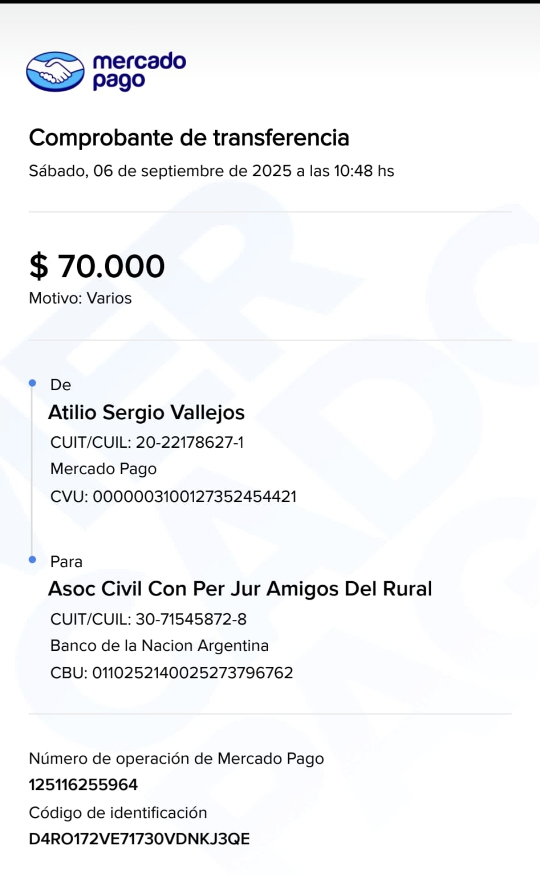 | Atilio Vallejos | ********** | DNI | 22178627 | Atilio Vallejos | 07/08/1971 | 54 | Masculino | Av jorge ortiz 1926 | San jorge | 2452 | Santa fe | vallejosatilio@gmail.com | +543406426967 | HOMBRES - Master C2- Años: 1970-1969-1968-1967-1966 | Hasta el 9 de septiembre de 2025 distancia 75K $70,000 | | Screenshot_20250906_105024_WhatsApp.jpg