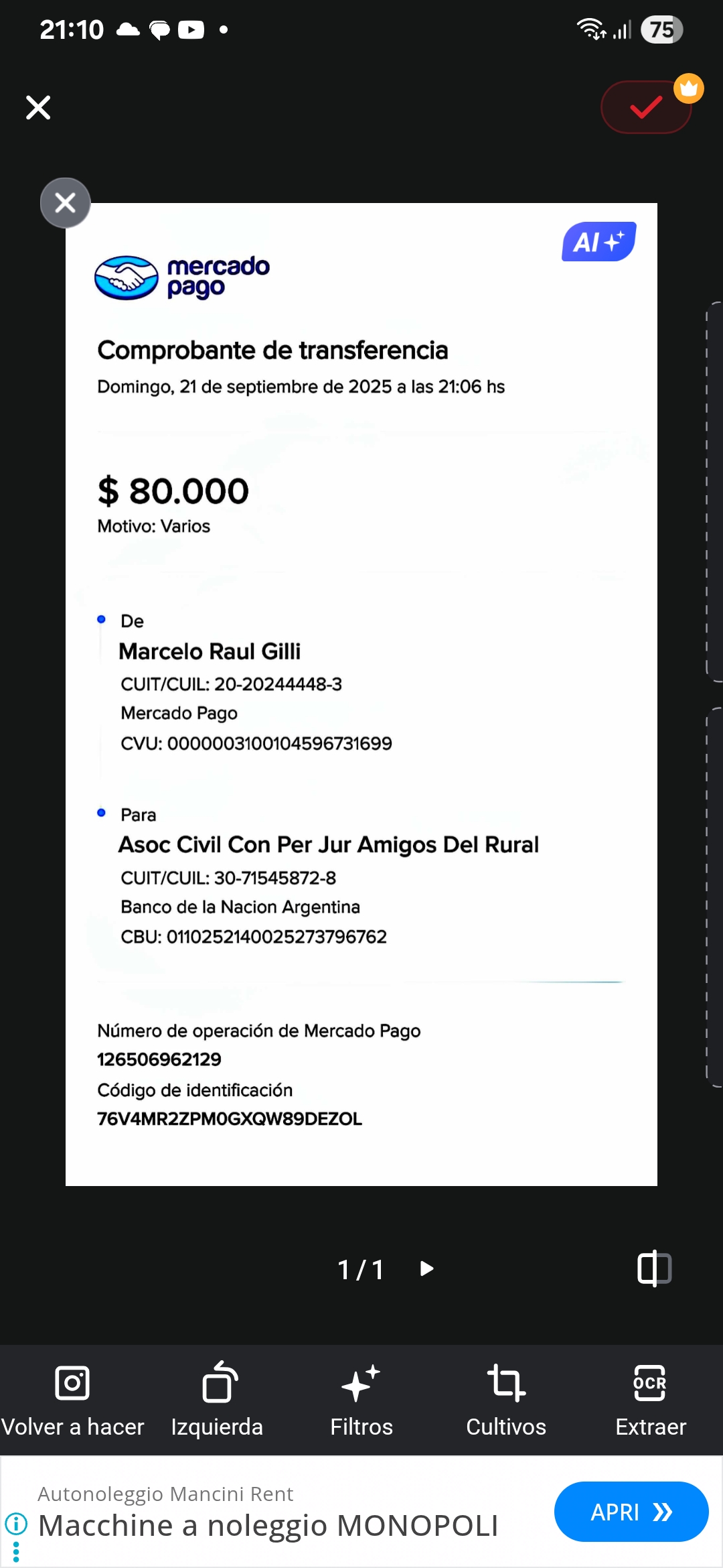 | Gillimarcelo@hotmai.com | ********** | DNI | 20244448 | Marcelo gilli | 12/02/1969 | 56 | Masculino | Revoluciom de los 7 jefes 688 | Sa pereira | 3011 | Ssnta fe | gillimarcelo@hotmail.com | +543404519084 | HOMBRES - Master C2- Años: 1970-1969-1968-1967-1966 | Hasta el 27 de septiembre de 2025 distancia 75K $80,000 | | Screenshot_20250921_211026_All-PDF-Reader.jpg