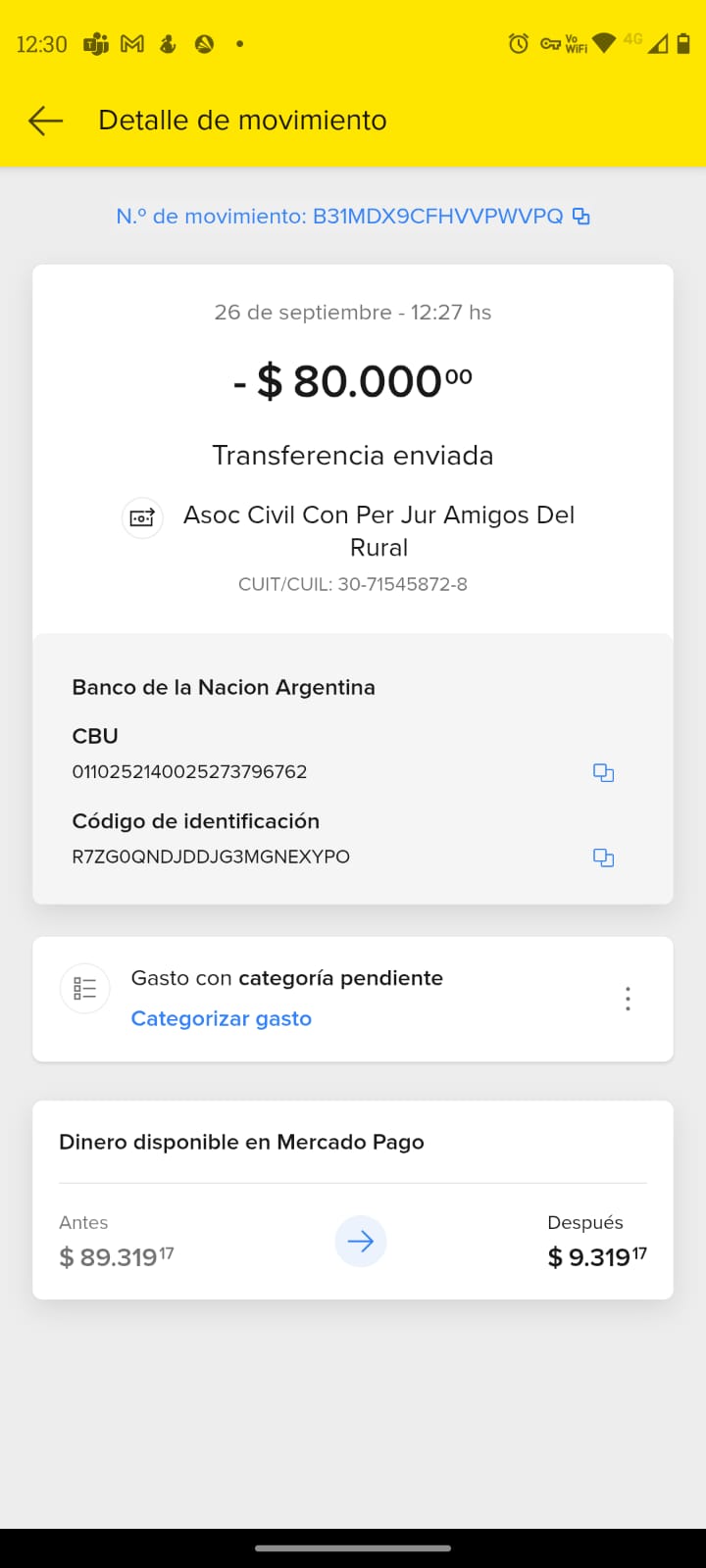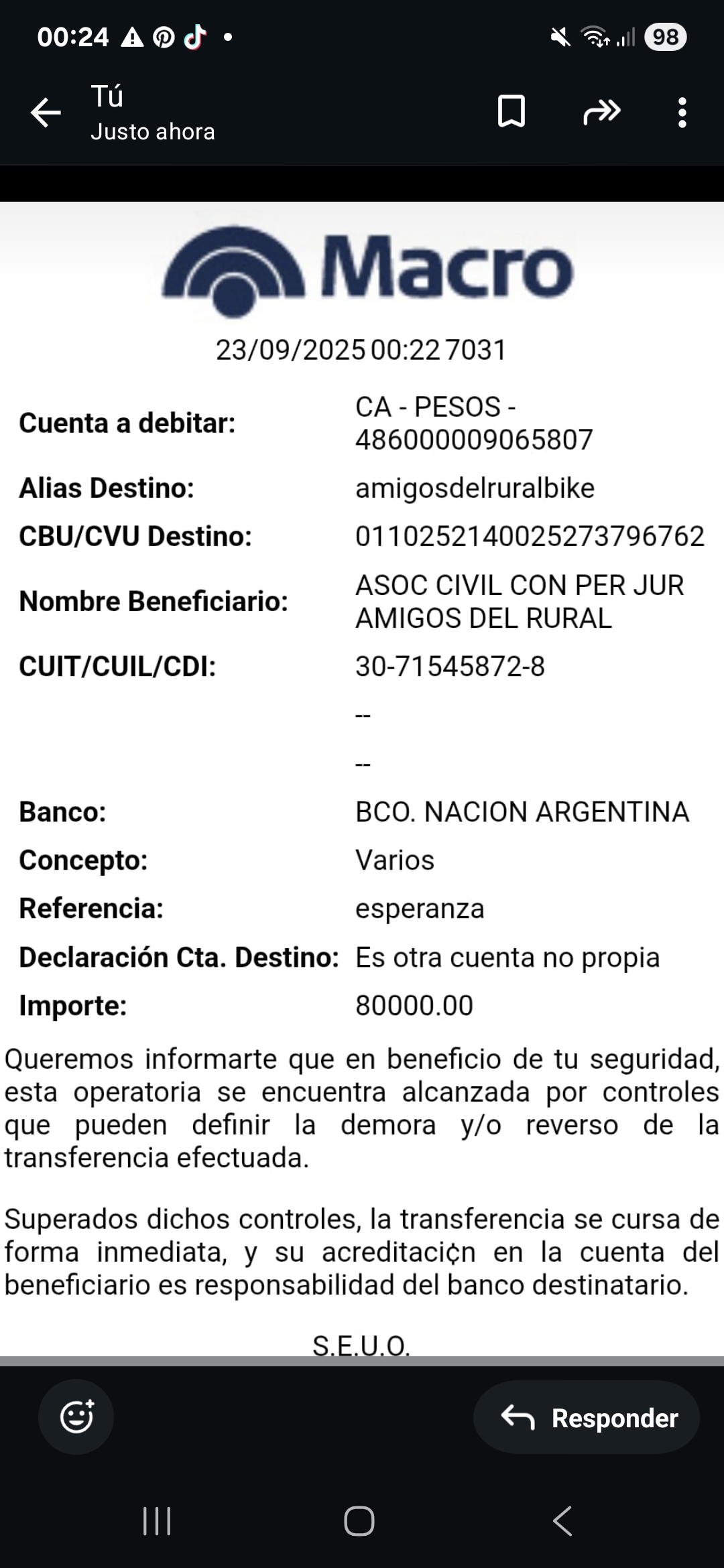 | Nestortaborda938 a.gmail.com | ********** | DNI | 52369674 | Esteban taborda | 23/05/2012 | 13 | Masculino | Sarmiento 6391 | Esperanza | 3080 | Santafe | nestortaborda938@gmail.com | +543496448582 | CICLOTURISMO | Cicloturismo distancia 30K $35000 | | transferencia_1755808009.png